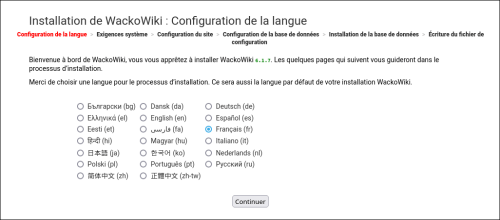 example.com/wiki-folder/dans un navigateur et suivez les instructions de l'installateur. - Vous pouvez régler la Configuration en éditant le fichier config.php pour ajustez les paramètres qui y sont enregistrés.