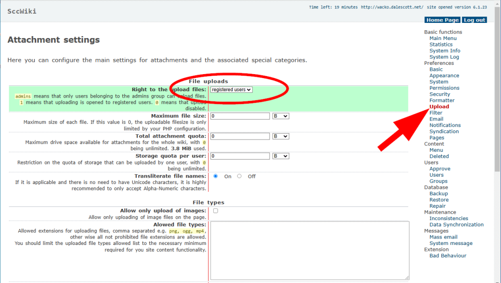 However, as an admin, the page permissions show file upload is allowed by any registered user (iiuc).